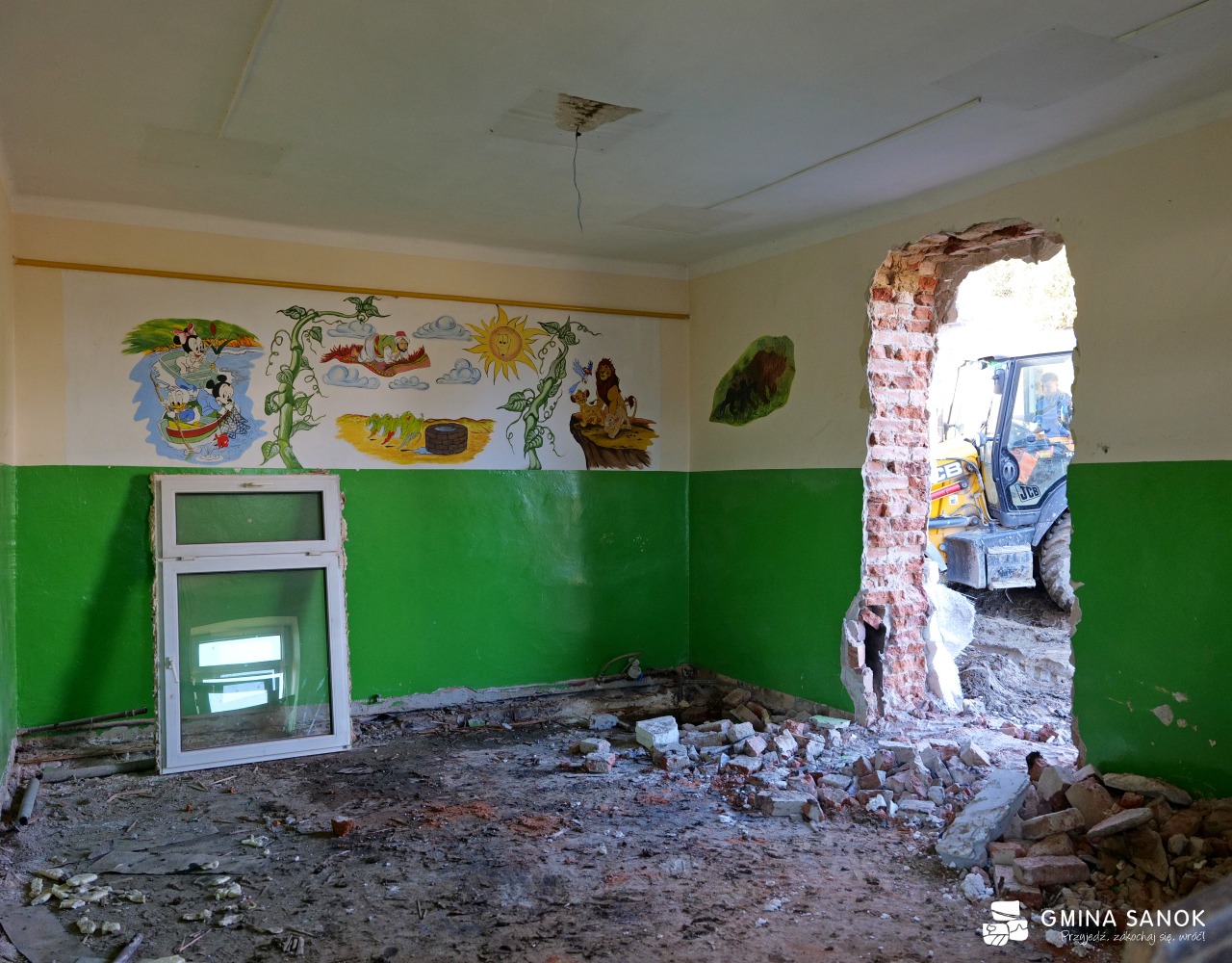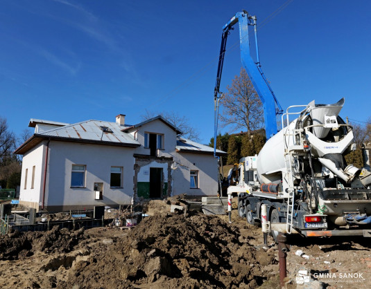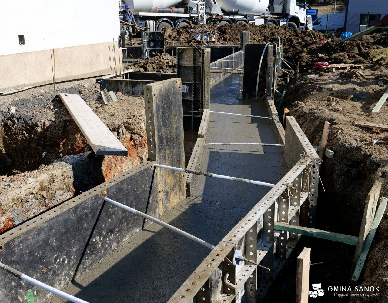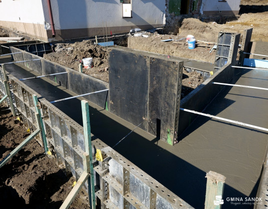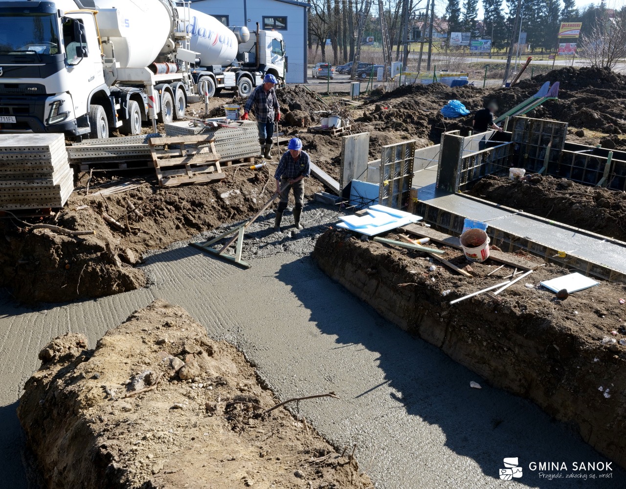 Obecnie prace weszły w kluczową fazę konstrukcyjną. Robotnicy wykonują ławy fundamentowe oraz wznoszą ściany z pustaków betonowych. Równolegle trwają roboty wyburzeniowe w częściach adaptowanych oraz przygotowanie terenu pod nowoczesny plac zabaw, który będzie sercem rekreacyjnym obiektu.