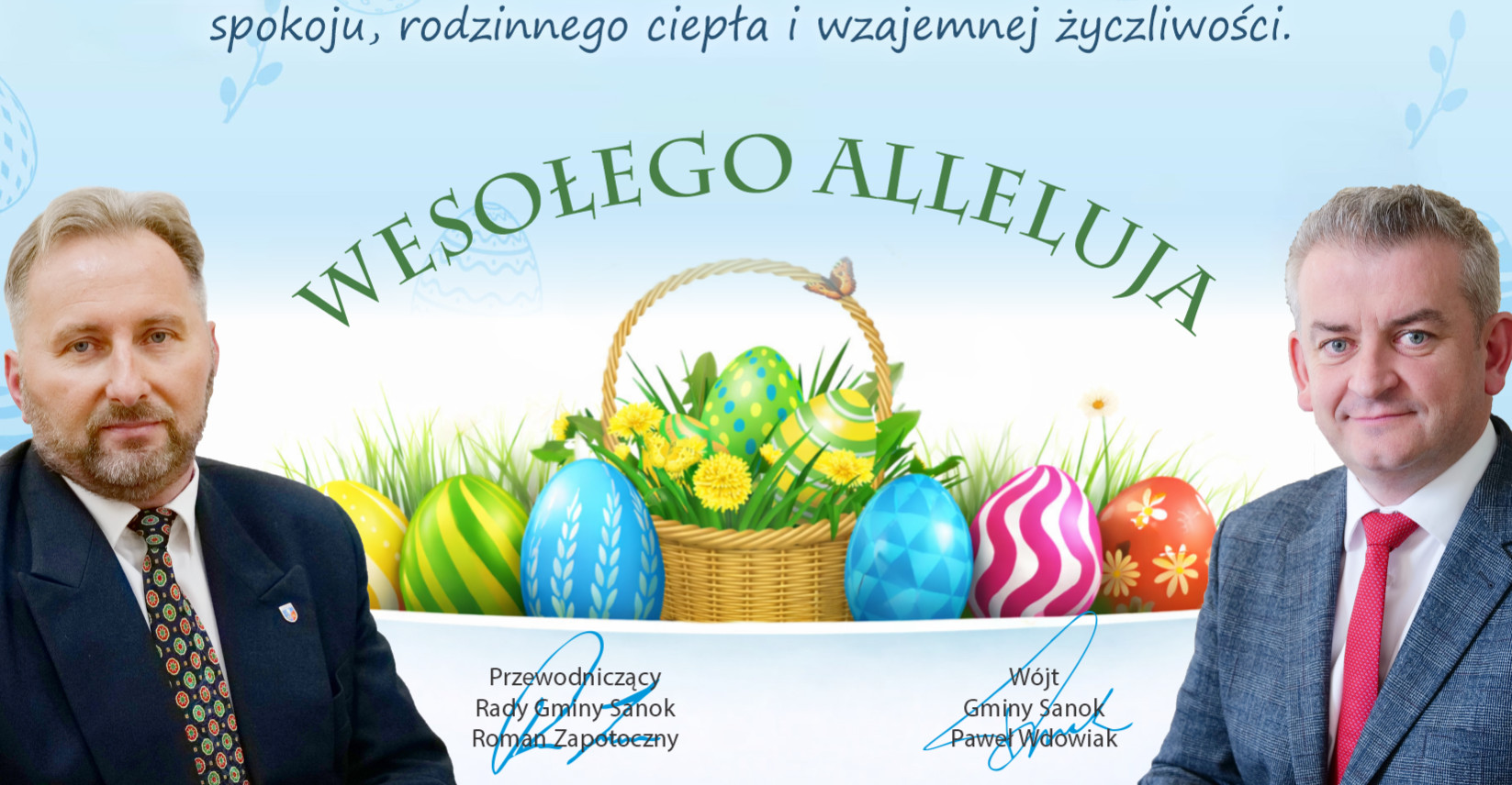 Z okazji Świąt Wielkanocnych najserdeczniejsze życzenia zdrowia, pogody ducha oraz głębokiego spokoju składają Wójt Gminy Sanok Paweł Wdowiak oraz Przewodniczący Rady Gminy Sanok Roman Zapotoczny.